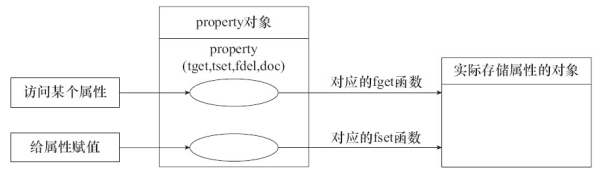 创建一个 property 实际上就是将其属性的访问与特定的函数关联起来,相对于标准属性的访问,property 的作用相当于一个分发器,对某个属性的访问并不直接操作具体的对象,而对标准属性的访问没有中间这一层,直接访问存储属性的对象: